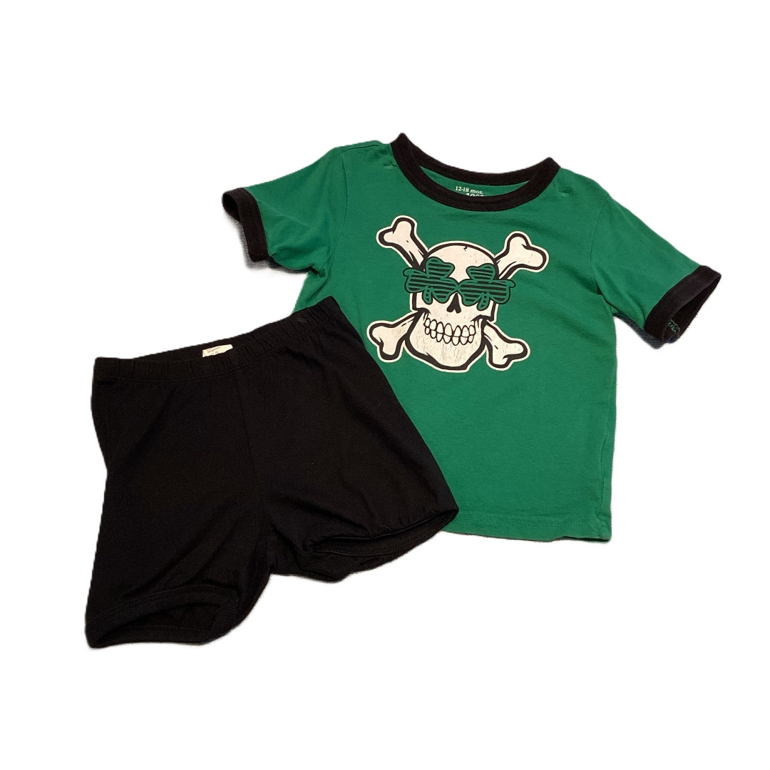12-18 Boys Children's Place Green Shamrock Skull T-Shirt, H&M Black Shorts