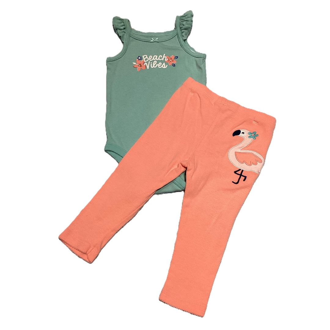 9-12 Girls Carter's Teal Sleeveless Beach Vibes Onesie, Matching Melon Capris w/Flamingo